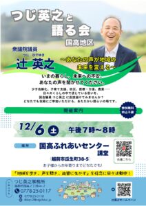 12月13日(土)午前10時30分より、白山公民館にて「つじ英之と語る会」を開催します。
