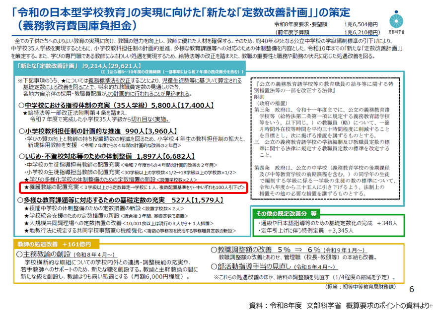 - 養護教諭(保健室の先生)の複数配置基準の引き下げ